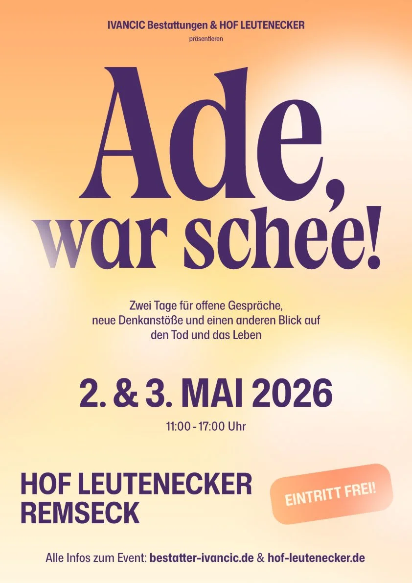 Am 2. und 3. Mai 2026 öffnet die Trauermesse „Ade, war schee!“ auf dem Hof Leutenecker ihre Türen. Mit einem klaren Anliegen: den Tod ein Stück zurück ins Leben zu holen. Raus aus der Tabu-Ecke – hin zu einem offeneren, ehrlicheren Umgang.
